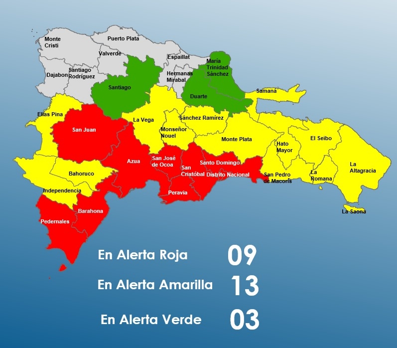 Santo Domingo. – El Centro de Operaciones de Emergencias (COE) informó que se mantienen nueve (9) provincias en alerta roja, trece (13) en alerta amarilla y tres (3) en alerta verde, ante el riesgo de inundaciones repentinas urbanas y rurales, crecidas de ríos, arroyos y cañadas, así como deslizamientos de tierra, provocados por los efectos asociados a la tormenta tropical Melissa.