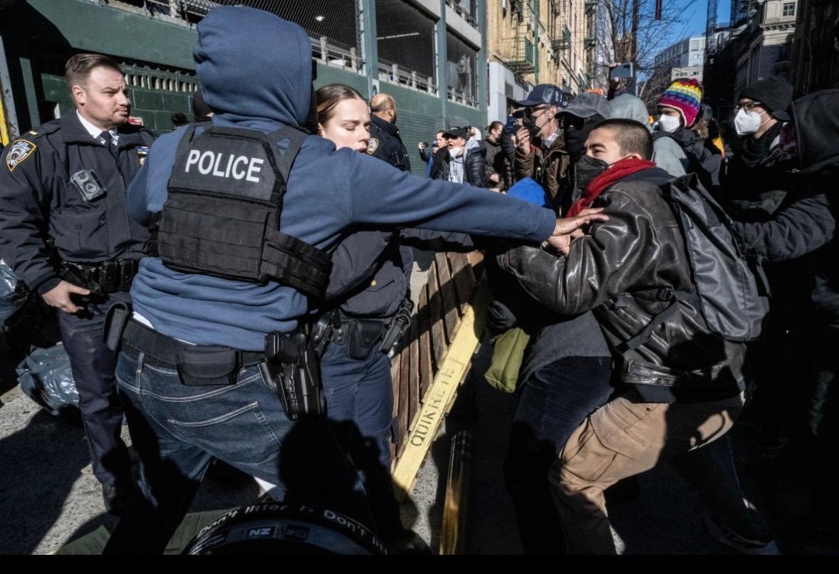 Ante la situación, ICE solicitó apoyo del NYPD, que emitió múltiples advertencias ordenando la dispersión de los manifestantes. Luego de despejar una de las salidas del garaje, oficiales fueron grabados utilizando gas pimienta mientras se enfrentaban a los manifestantes, quienes perseguían la caravana de vehículos y lanzaban basura y escombros desde un contenedor cercano.