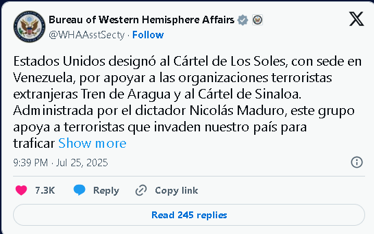 “Administrado por el dictador Nicolás Maduro, este grupo apoya a terroristas que invaden nuestro país para traficar narcóticos, enriquecerse e infligir violencia contra las comunidades”, indicó la Oficina del Departamento de Estado encargada de Latinoamérica en su cuenta de X.