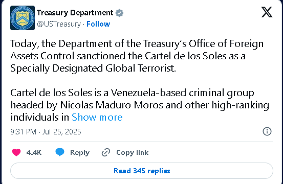 La decisión de incluir al Cartel de los Soles en la lista de organizaciones terroristas, agregó la publicación, permitirá que EE.UU. use «todos los recursos a su disposición» para impedir que Maduro siga beneficiándose de la destrucción de vidas estadounidenses y desestabilizando el hemisferio.