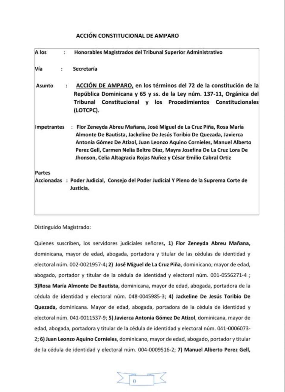 La acción fue introducida por el abogado Ángelo Hernández Disla, quien sostuvo que buscan el reconocimiento de derechos adquiridos y el fin de una violación sistemática a garantías constitucionales, en defensa del Estado Social y Democrático de Derecho.
