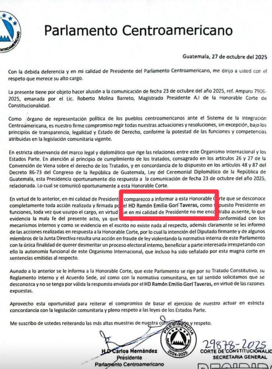 El documento, firmado por el presidente del PARLACEN, Carlos Hernández, indica que las acciones de Goris “carecen de validez legal y violan la normativa interna del Parlamento”, realizadas sin aval de los órganos competentes y con el propósito de interferir en un proceso electoral interno para beneficiar intereses particulares.