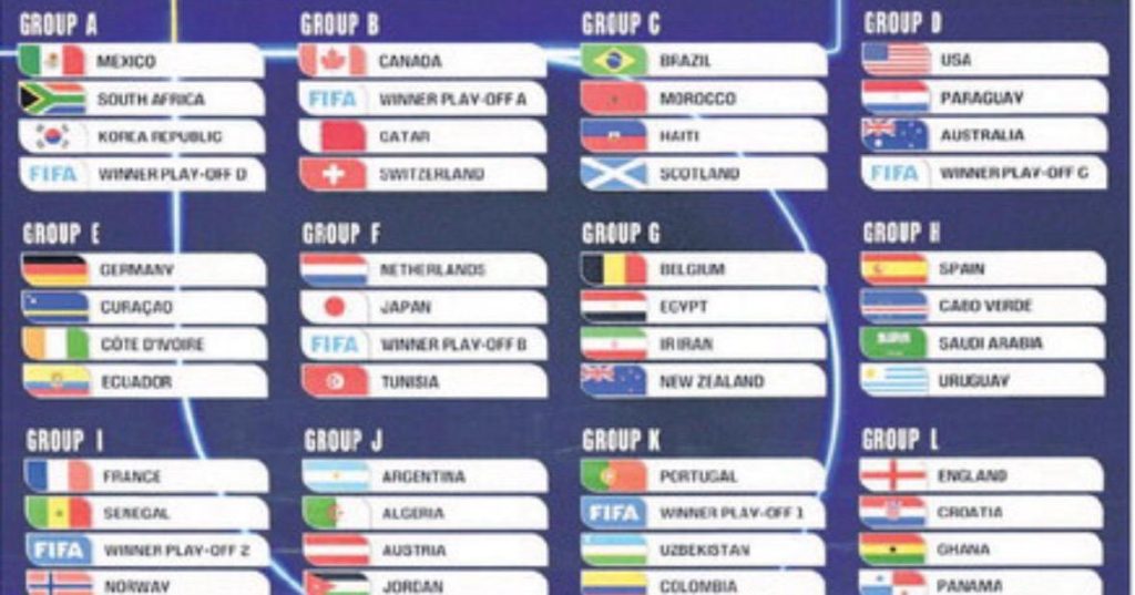 El sorteo del Mundial 2026 definió los 12 grupos de un torneo que contará con 48 selecciones, cada una garantizada a jugar al menos tres partidos. El Mundial se inaugurará el 11 de junio en Ciudad de México con un partido entre México y Sudáfrica. La selección estadounidense enfrentará en la fase de grupos a Paraguay, Australia y un rival por definir entre Turquía, Rumanía, Eslovaquia o Kosovo. El campeón defensor Argentina quedó en un grupo junto a Argelia, Austria y Jordania, mientras que el grupo considerado más difícil incluye a Francia, Senegal y Noruega, junto a un equipo por definir entre Irak, Bolivia y Surinam.