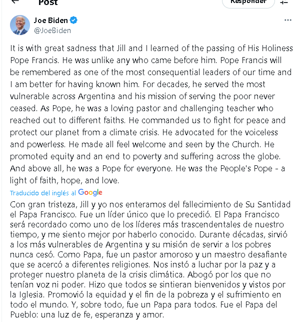 Por su parte el expresidente Joe Biden, segundo católico en ocupar la presidencia de Estados Unidos, calificó a Francisco como “el Papa del Pueblo, una luz de fe, esperanza y amor”. En un comunicado expresó: “Francisco será recordado como uno de los líderes más trascendentales de nuestro tiempo, y yo soy mejor por haberlo conocido”. Biden elogió su trabajo con los pobres, su defensa del medio ambiente y su apertura hacia otras religiones. En enero, le otorgó la Medalla Presidencial de la Libertad, aunque no pudo entregársela personalmente por los incendios en California.