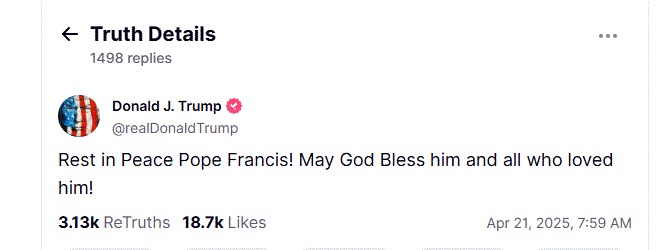 El presidente Donald Trump fue uno de los primeros en reaccionar tras publicarse la noticia. Público un breve mensaje en Truth Social: “Rest in Peace Pope Francis! May God Bless him and all who loved him!”. Trump recordó su encuentro con el pontífice en mayo de 2017 durante una audiencia privada en el Vaticano, en la que también participó la entonces primera dama Melania Trump. A pesar de diferencias públicas en el pasado, el presidente Trump optó por un tono sobrio para despedir al líder de la Iglesia Católica.